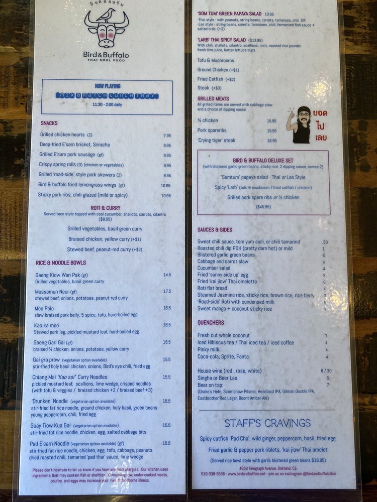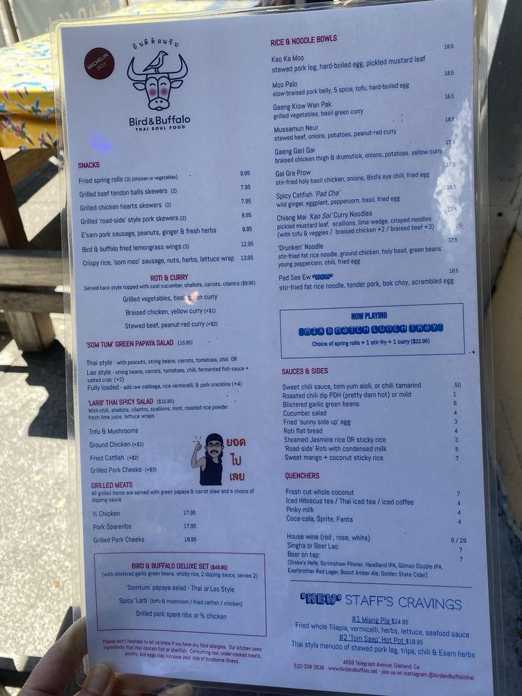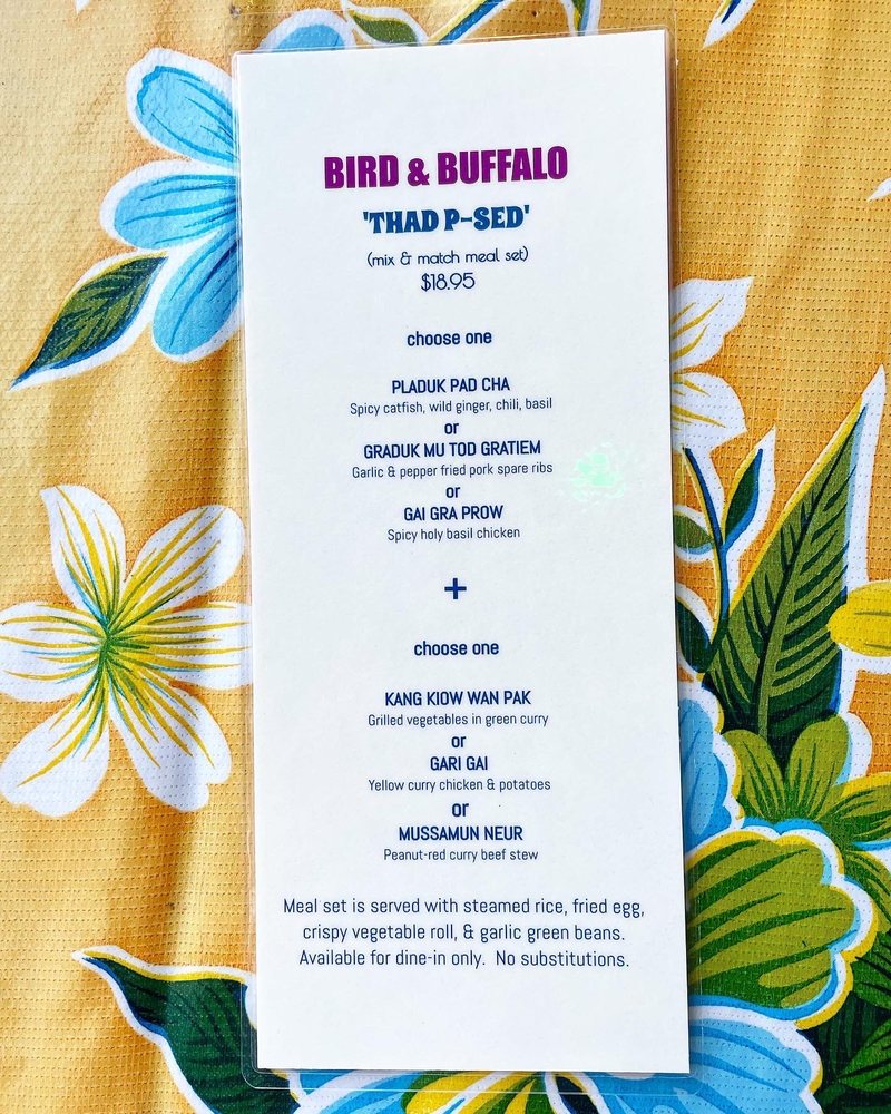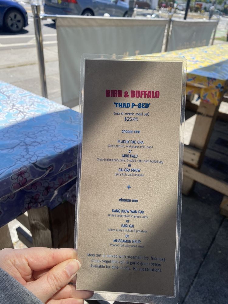Welcome to Bird & Buffalo, a gem in the heart of Oakland, offering a vibrant culinary experience rooted in authentic Thai flavors. This women-owned establishment thrives in a trendy, casual setting that welcomes everyone, including your furry friends. The menu showcases a range of dishes, from crispy vegetable spring rolls to hearty curries like the Mussamun Neur, each crafted with love and attention to detail.